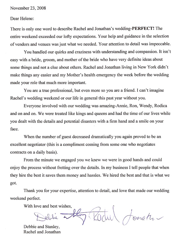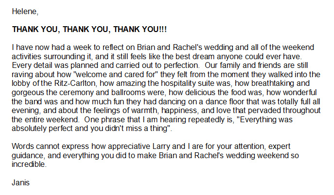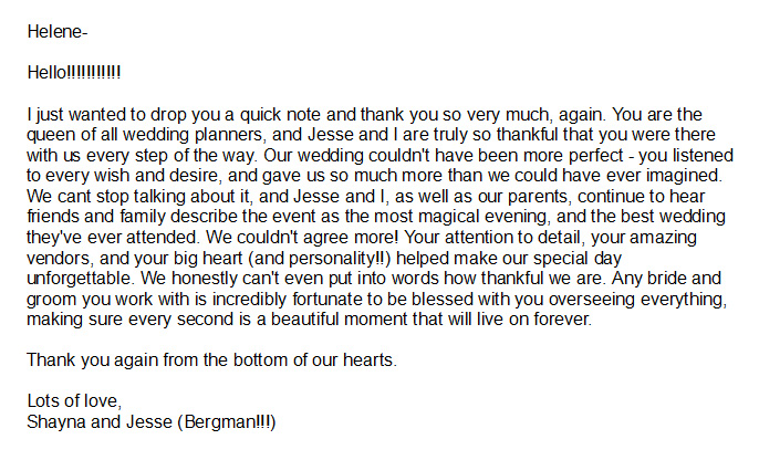 "HELENE...THANK YOU from the bottom of my heart for making the wedding weekend beyond all of my hopes and dreams. It was truly amazing!!!!!! I am pretty sure I am going to go through Helene-withdrawals now. I loved getting to spend time with you. Working with you was like working with family; as Neil pointed out I love my family. Thank you doesn't quite sum it up, but its all I can say at the moment."