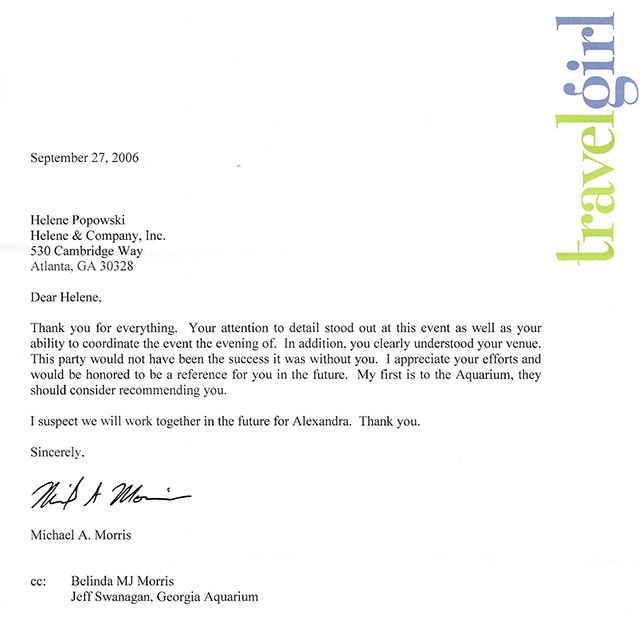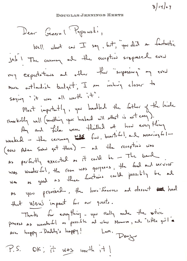 "Thank you for everything. Your attention to detail stood out at this event as well as your ability to coordinate the event the evening of...This party would not have been the success it was without you."